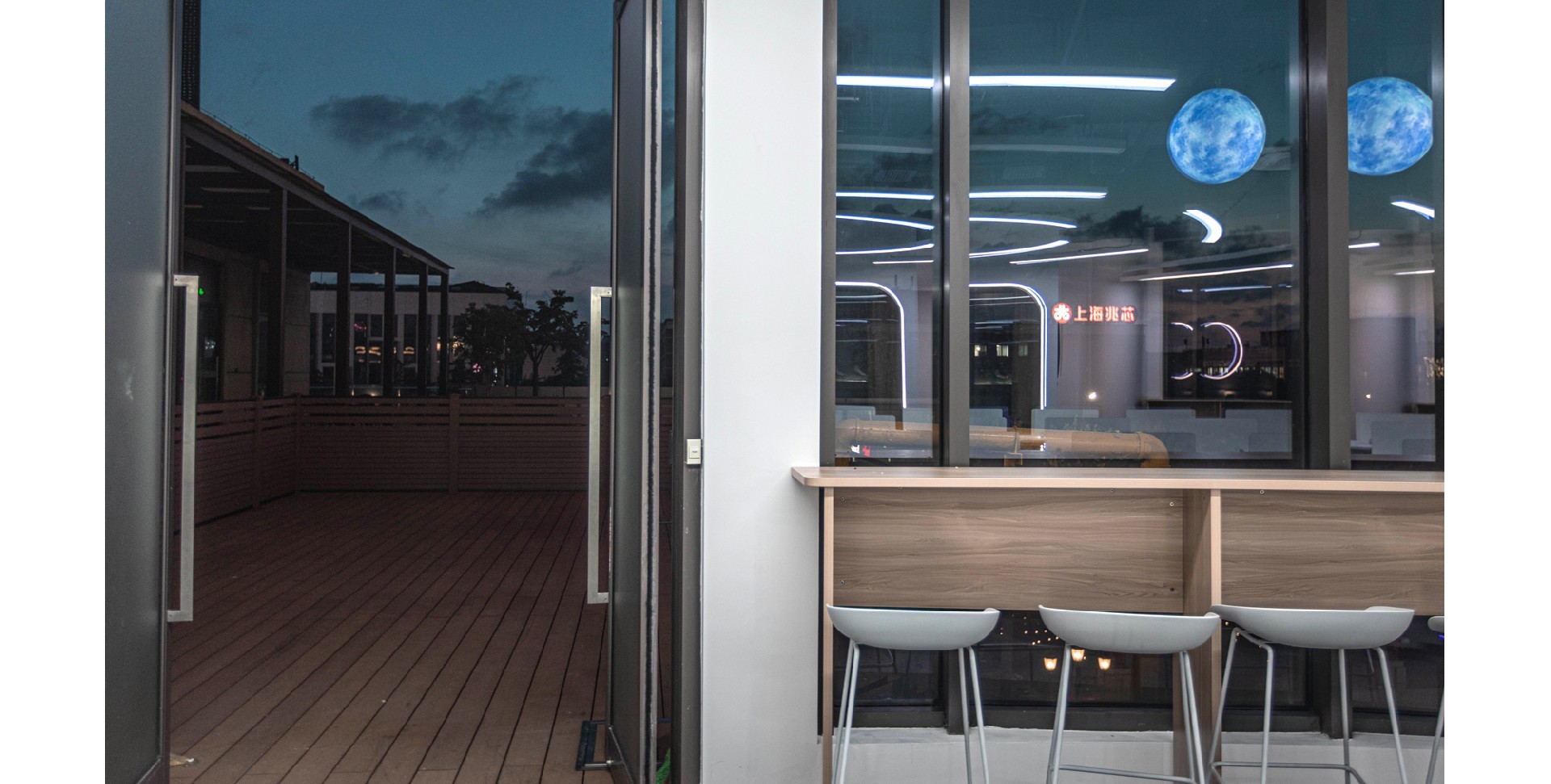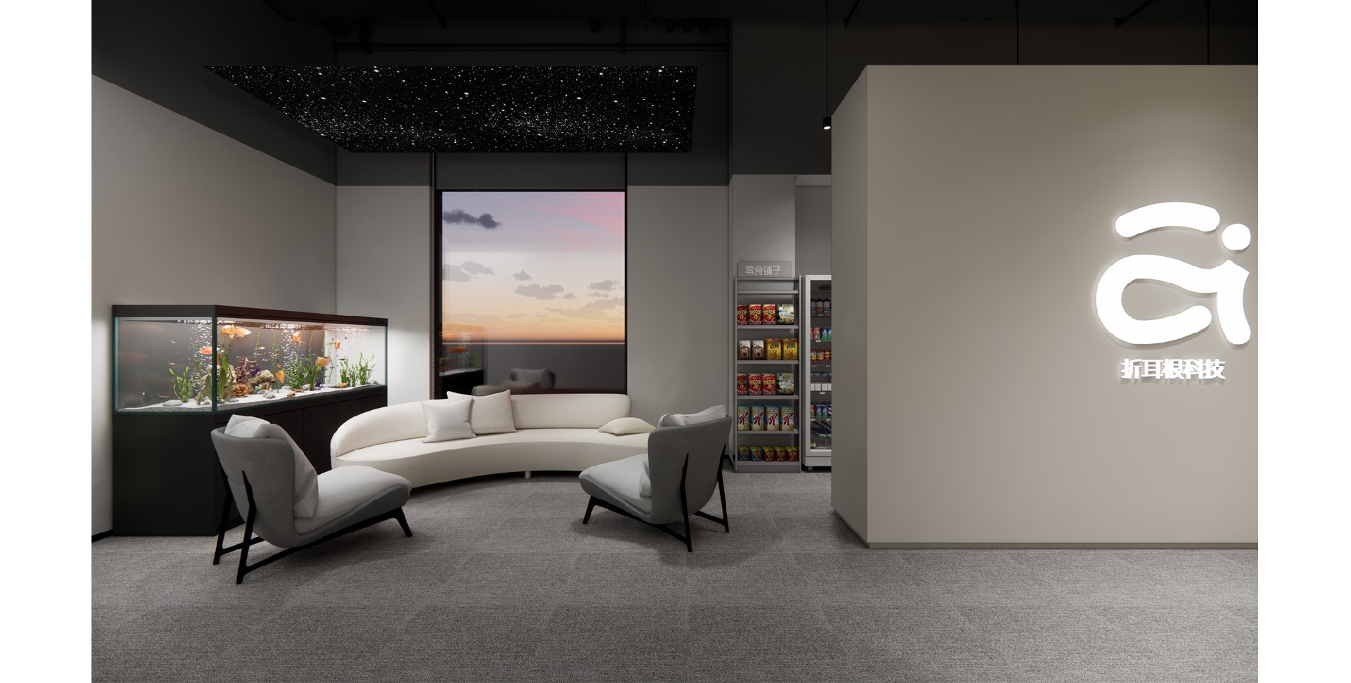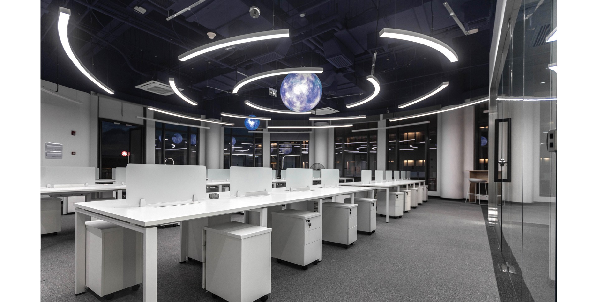 辦公室采用了現(xiàn)代簡約的設(shè)計(jì)風(fēng)格,體現(xiàn)了現(xiàn)代辦公環(huán)境的專業(yè)性和高效性。以白色和深色為主色調(diào),白色代表純潔、明亮,深色則賦予空間穩(wěn)重感。頂部加入行星的科技元素,增加了空間的活力與視覺焦點(diǎn),象征著廣闊與未來。