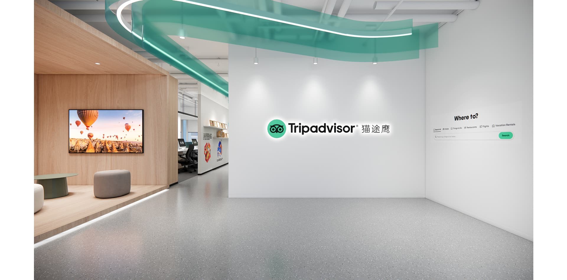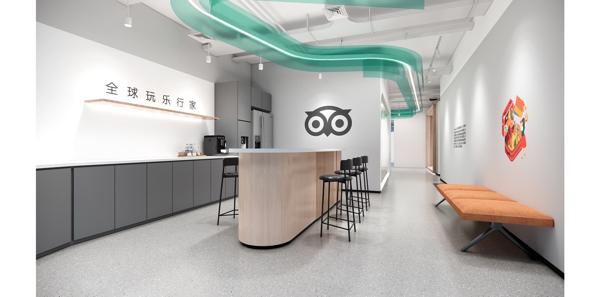 貓途鷹辦公室裝修設(shè)計(jì)以?簡(jiǎn)約靈動(dòng)?為基調(diào),融入品牌標(biāo)志與?全球旅行元素?,搭配開放式布局與活力色彩,打造兼具協(xié)作效率與探索氛圍的辦公空間。
