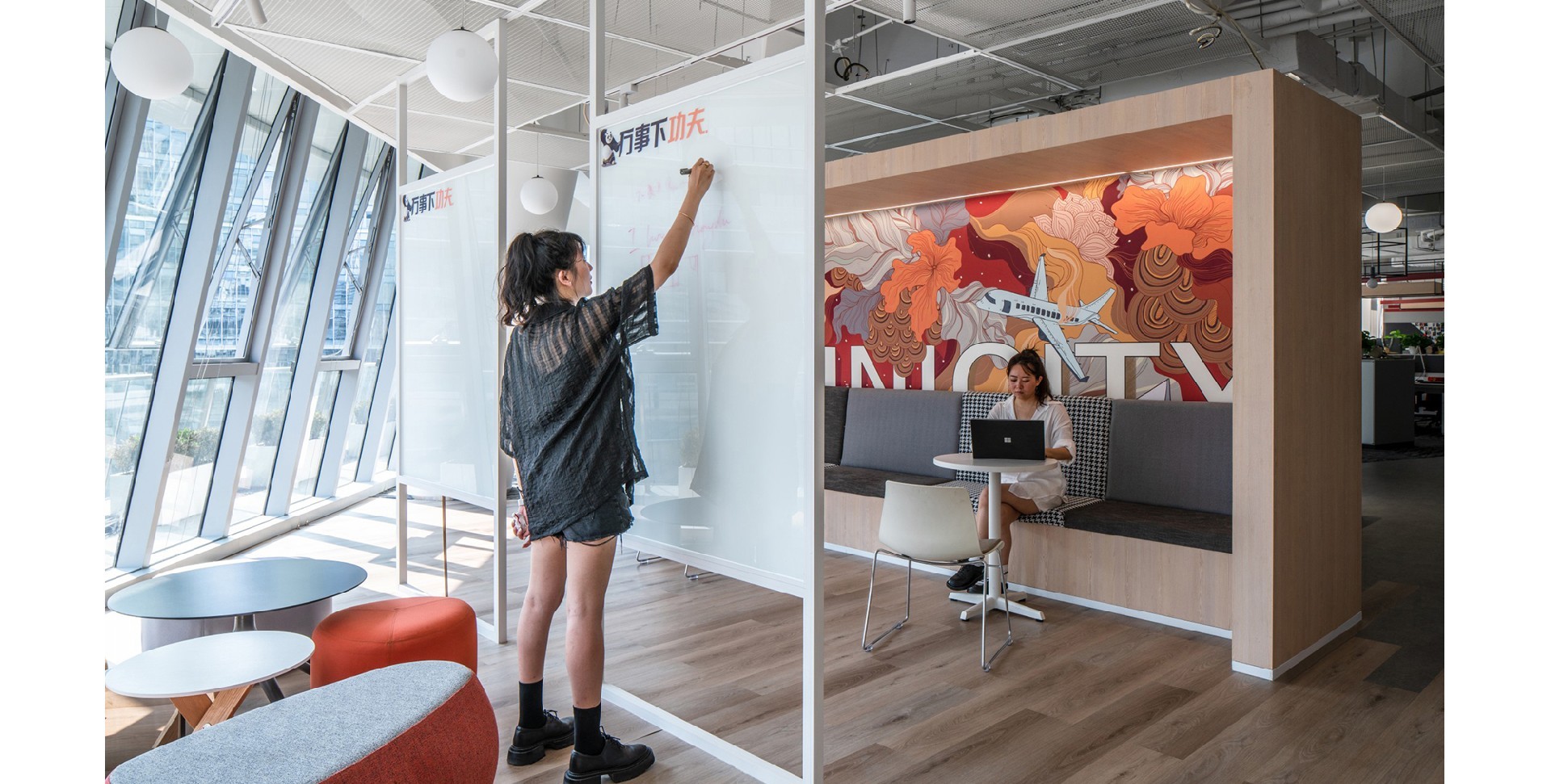 The design combines modern technological elements with natural plants to create a modern and warm environment. By designing multifunctional office spaces, different work needs can be met...